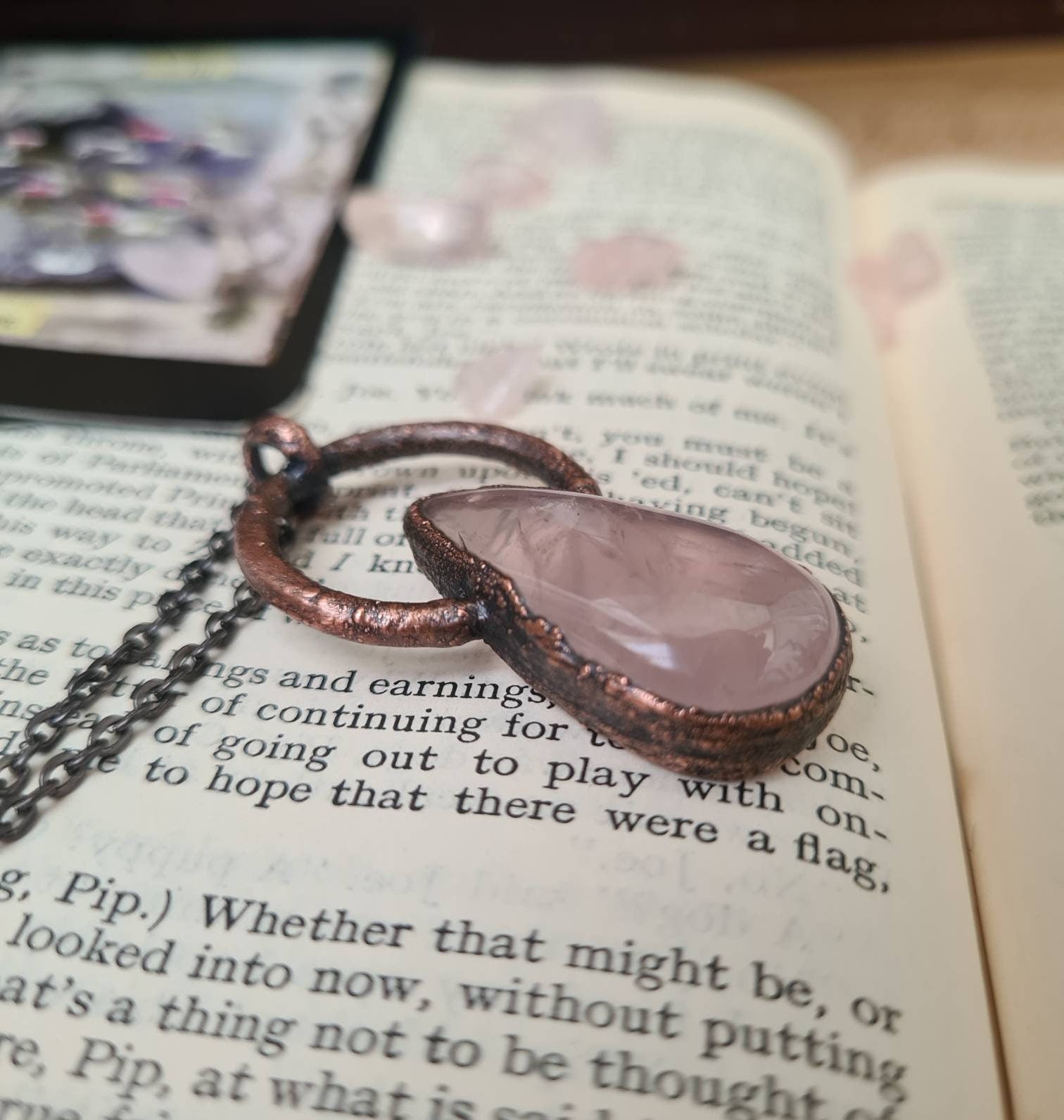 Rose Quartz Pendant - Teardrop Gemstone - Copper Electroformed
